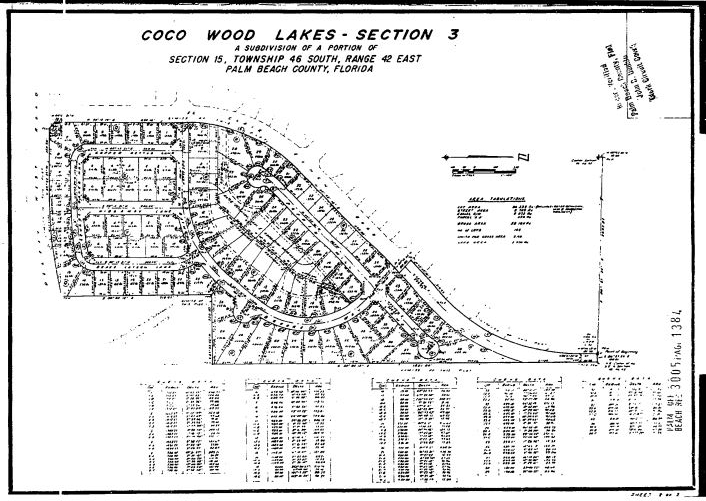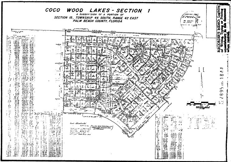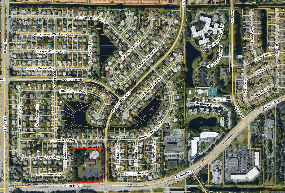 This screenshot from the Palm Beach County GIS Ownership Records viewer shows parcel boundaries (yellow). The clubhouse is a separate parcel highlighted in red. Around the nearby lake, the parcel lines radiate into/through the waterbody in wedge-shaped segments, reflecting an older/private-lot parceling pattern rather than a single “common area” lake tract. In many newer subdivisions, stormwater lakes/ponds are instead platted as dedicated water management tracts/common areas with required maintenance access easements, and post-construction maintenance responsibility typically shifts to the HOA (or a contracted manager).2 3 4
