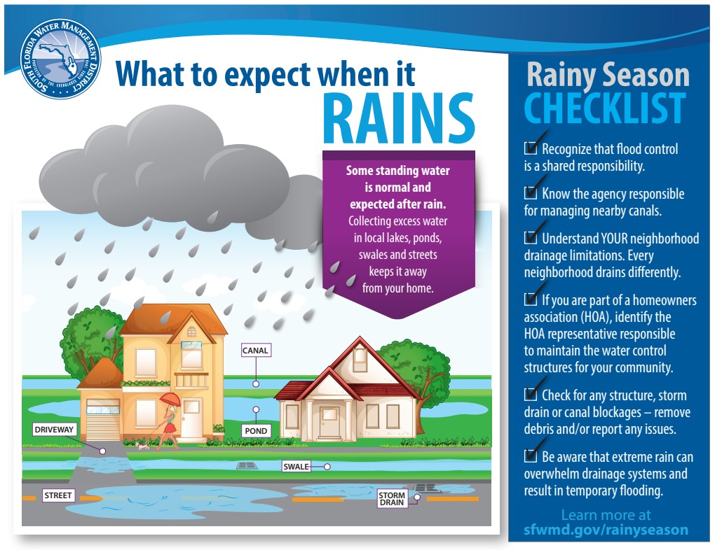 Flood control in South Florida is a shared responsibility and is achieved through an interconnected, three-tiered drainage system. Neighborhood drainage systems, or tertiary systems, are operated by property owners or residential associations. Secondary flood control canals are operated by the Lake Worth Drainage District, and primary flood control is provided by the South Florida Water Management District. The Lake Worth Drainage District works closely with the South Florida Water Management District before, during and after rainfall events to provide flood control for the residents of Palm Beach County. Water managers are continually monitoring weather systems and canal levels in order to proactively respond to heavy rainfall events. In anticipation of a heavy rainfall event, the Lake Worth Drainage District water control structures are opened in order to maintain appropriate water levels in the system. Residential communities are designed to retain water in swales and onsite detention ponds. With prior authorization from the Lake Worth Drainage District, excess stormwater may be discharged into District canals through control structures with fixed or operable weirs to prevent flooding of property.